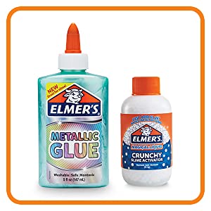 В комплект входит по 1 бутылке: металлический клей (бирюзовый, 141 гр), светящийся в темноте клей (зеленый, 141 гр), клей для изменения цвета (желто-красный, 141 гр), полупрозрачный клей (розовый, 141 гр), клей с блестками (серебро, 170 гр), металлический активатор слаймов (65 г), светящийся в темноте активатор слаймов(65 г), активатор хрустящих слаймов (51,2 г) и 2 бутылочки конфетти-активатора слаймов (65 г каждая). Клей с оранжевой крышкой.