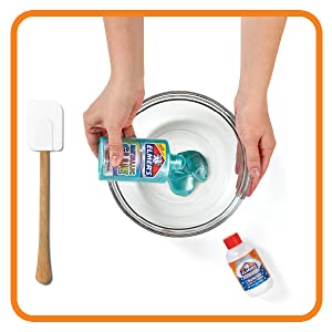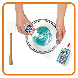 Берем бутылку клея Элмера и хрустящие волшебные шарики Элмера (по мере необходимости). Еще понадобится миска для перемешивания и лопатка.