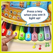 Разучите 20 песенок нота за нотой, следуя указаниям подсвеченных клавиш, поощряя активное участие и навыки подражания.