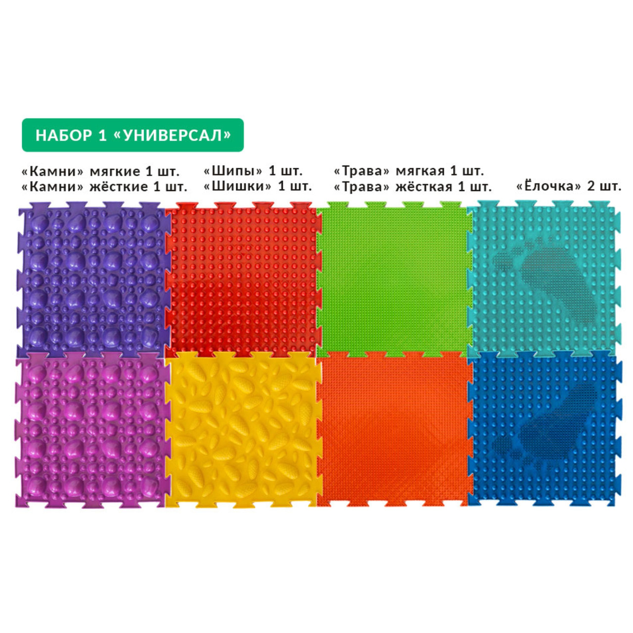 Набір «Універсал»: 1 «Камені» м'які, 1 «Камені» жорсткі, 1 «Шипи», 1 «Шишки», 1 «Трава» м'яка, 1 «Трава» жорстка, 2 «Ялинка».